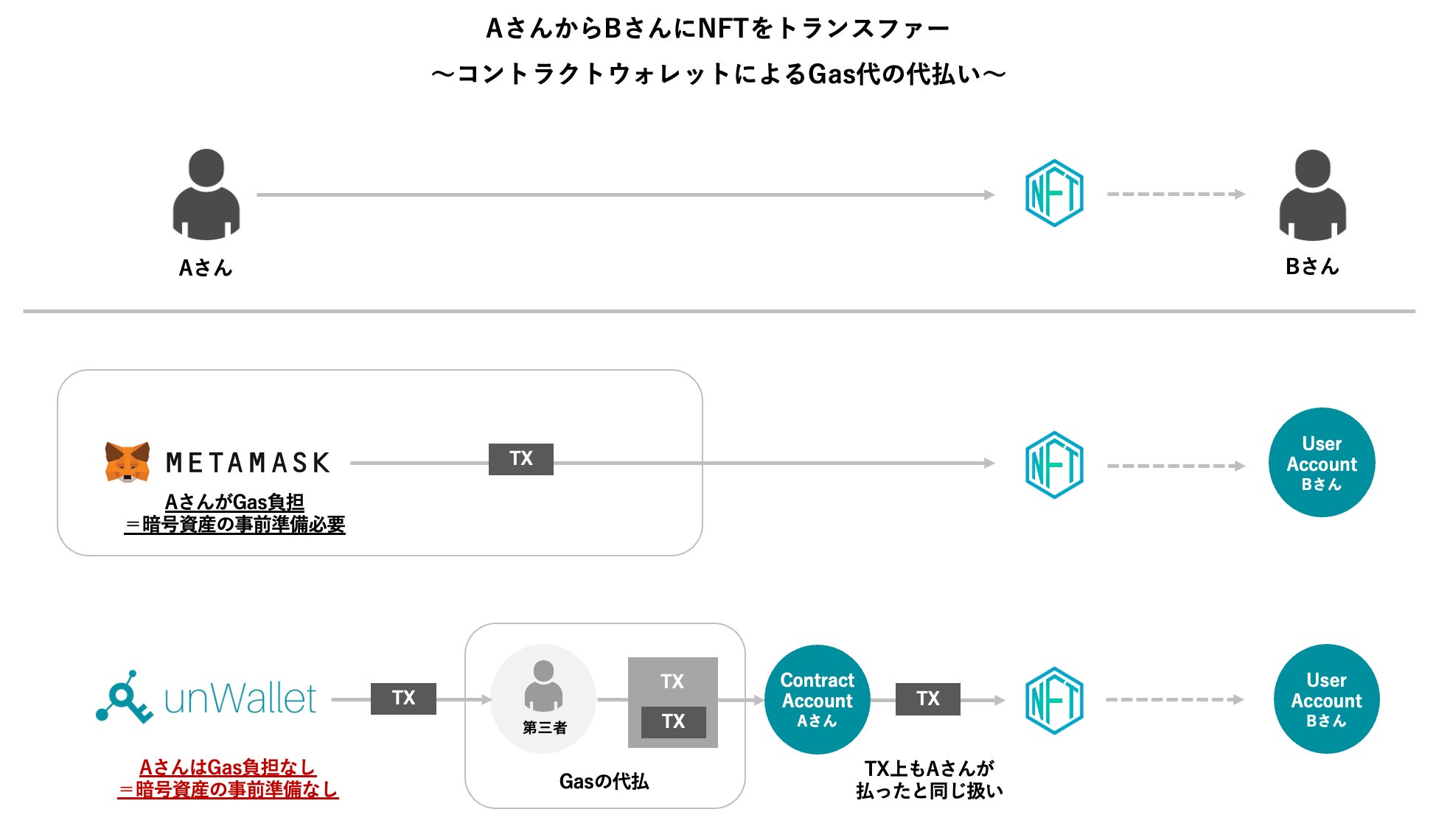 ※1:コア機能がスマートコントラクトで実装されたウォレットの総称です。ブロックチェーンの外でアカウントを管理する形式(EOA)とは異なり、複数の鍵による権限管理、鍵の紛失などに対応できるソーシャルリカバリー、暗号資産未保有ユーザーへのサポートを可能にするメタトランザクション(トランザクションやその手数料支払いの代理実行)など、スマートコントラクトだからこそ実現可能な機能を有しています。