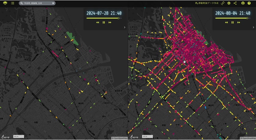 「Kompreno®︎」は、日本全国どこでも、お客さまが指定した施設や観光地などへの人の流れや、市区町村内での人の動きを動画で分析できる、人流可視化分析ツールです。わずか数クリックの簡単な操作で、指定エリア内の人の流れや滞在状況を分析できます。2画面表示機能により、異なる日付やエリアを並べて比較できるため、道路交通状況の変化を分析することができ、出店戦略の策定や都市開発、観光、防災など、幅広い分野でご活用いただけます。