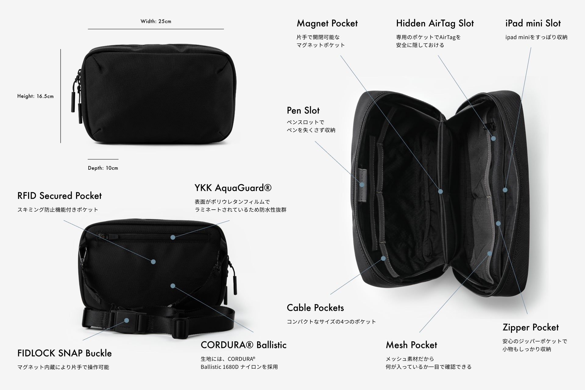 中央のマグネットポケットや、AirTag専用の隠しポケット、さらに、YKK AquaGuard®ファスナーとRFIDスキミング防止機能を搭載した背面ポケットなど、ガジェットや用途に沿った収納により、ミニマルで機能的に仕上げました。