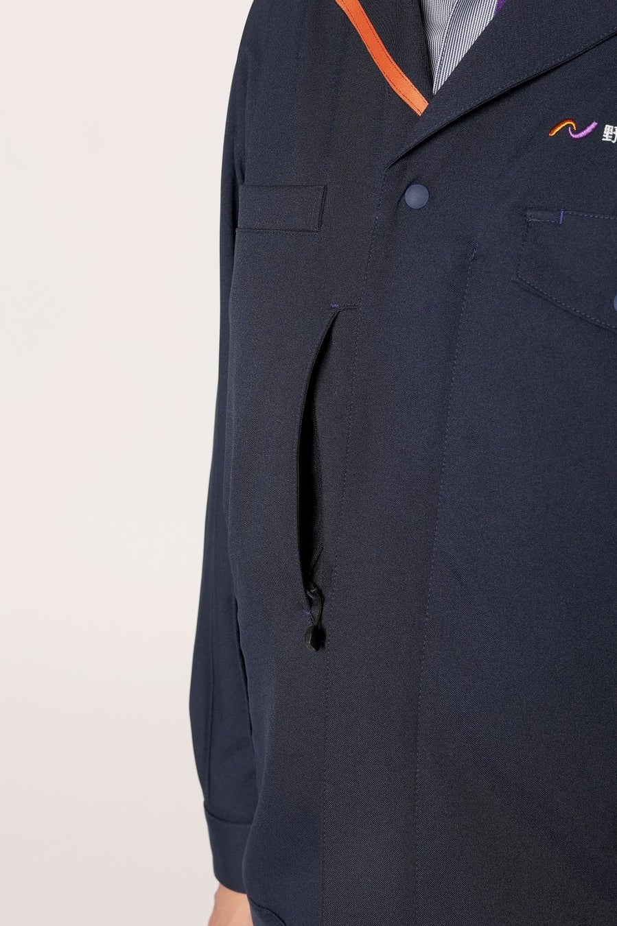 ・ブルゾンとシャツの前立てに、アクセントとしてコーポレートカラーの紫とオレンジを使用し、シンプルながらも印象的なデザインに