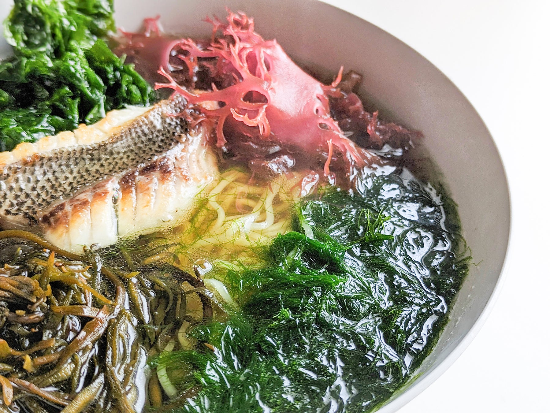 すし作家・海藻料理研究家として活躍する、シーベジタブルのパートナーシェフ・岡田大介氏が監修した「海藻と旬魚のラーメン」。実はスープものと相性がよい海藻類。ラーメンのスープは、刺身で食べられる鮮度の魚のアラや頭を焼いて、昆布とネギ、「青のりしょうゆ」と塩のみで味を整えています。最高級品種と言われる生のすじ青のりを発酵させて作る「青のりしょうゆ」は、シーベジタブルから生まれたブランドRe-seaweedが開発した、これまで世界に存在しなかったまったく新しい海藻発酵調味料です。