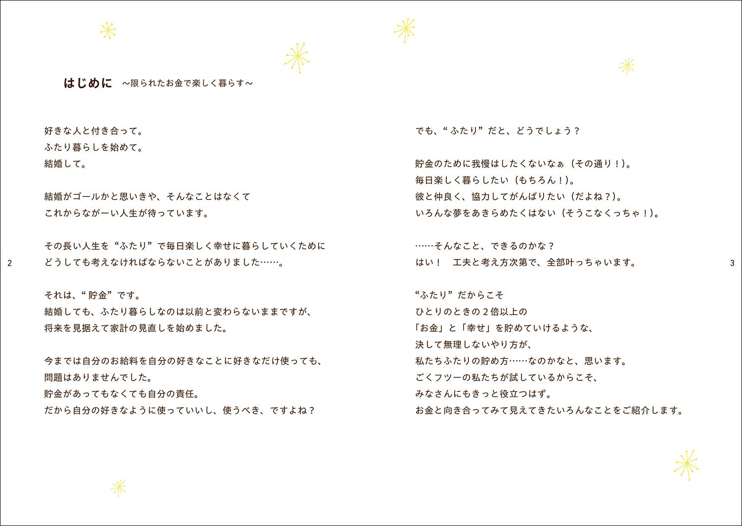 この本を作るにあたり、「貯金のイメージが少しでもプラスになればいいな」と思いながら書きました。ふたりの将来のために考えなければいけないことはたくさんありますが、「この方法なら私でもできる。楽しそう」と感じられることを1つでも見つけていただけたなら、また、貯金を考えるヒントになれば嬉しいです。