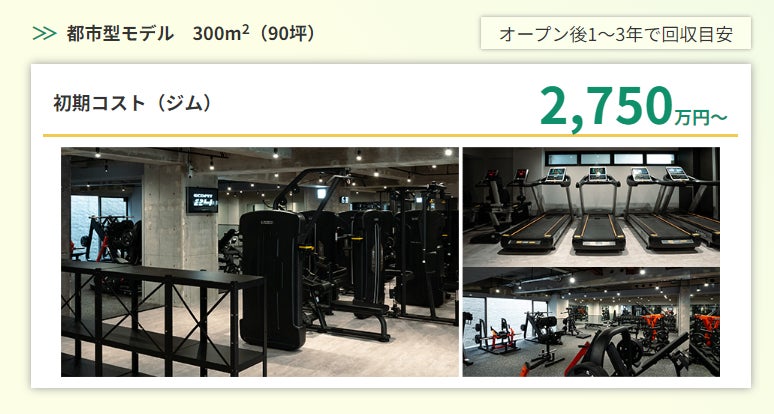 また、フランチャイズオーナー様向けに弊社のマシンを特価でご提供させていただくので90坪の店舗であれば開業する際の費用は約3000万〜と一般的なジムの約半分の投資費用で開業可能となります。