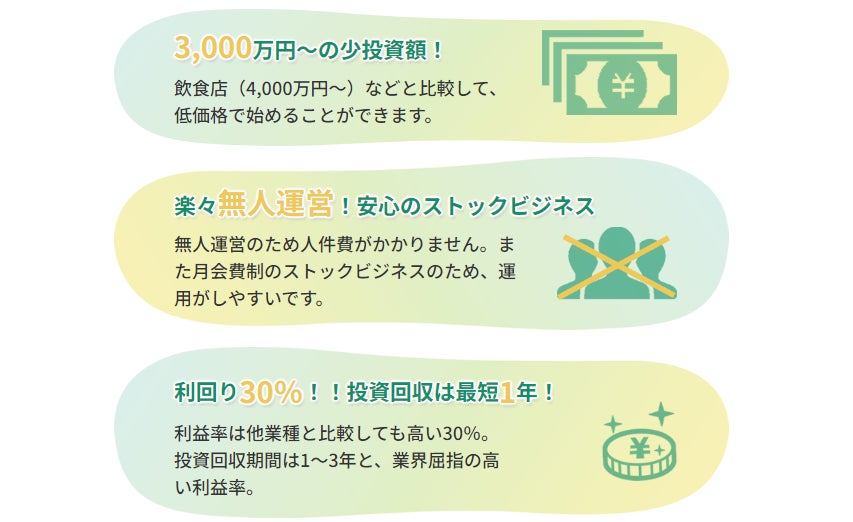 高い利益率によって投資回収期間は1年〜3年と早期投資回収が可能となっております。