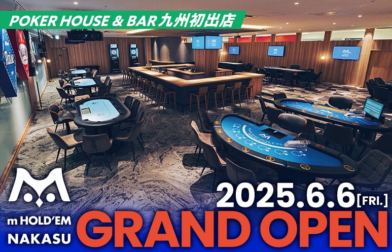 サミー株式会社(本社:東京都品川区 代表取締役 社長執行役員 COO:星野 歩)の子会社でポーカー事業におけるアミューズメントカジノ店舗運営を手掛けるm2R株式会社(本社:東京都品川区 代表取締役 社長執行役員:伊藤 保勝、以下エム ツーアール)は、福岡市博多区にテキサスホールデムポーカーが遊べるPOKER HOUSE & BAR「m HOLD’EM 中洲」を2025年6月6日(金)にオープンいたします。