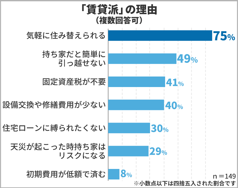 続いて「賃貸」を選んだ方に理由を聞いてみると、「気軽に住み替えられる」「持ち家だと簡単に引っ越せない」「固定資産税が不要」「修繕費用が少ない」という声が多く届きました。