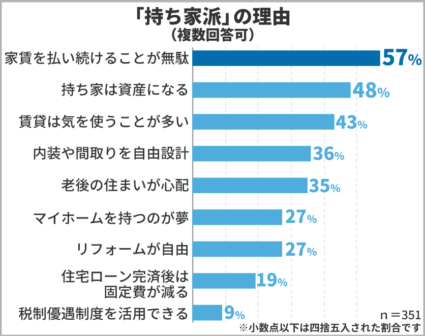 持ち家を選んだ方に理由を聞いてみると、「家賃を払い続けることが無駄」「持ち家は資産になる」「賃貸は気を使うことが多い」「内装や間取りを自由に設計できる」という声が多く届きました。