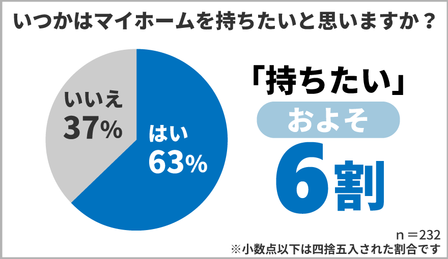 現在「賃貸」にお住まいの方232人に、「いつかはマイホームを持ちたいと思いますか?」と質問したところ、6割以上の方が「マイホームを持ちたい」と回答されました。