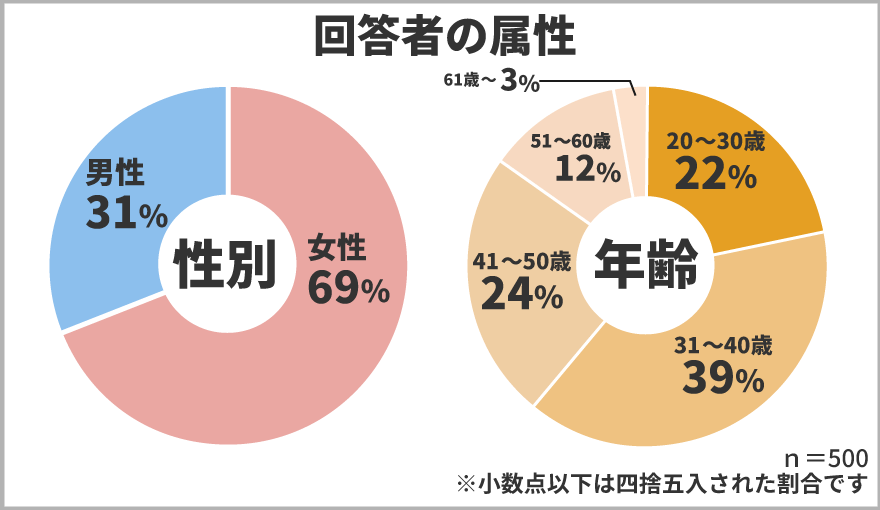 今回ご協力頂いたのは、20歳から61歳以上の男女500名で属性は以下の通りです。