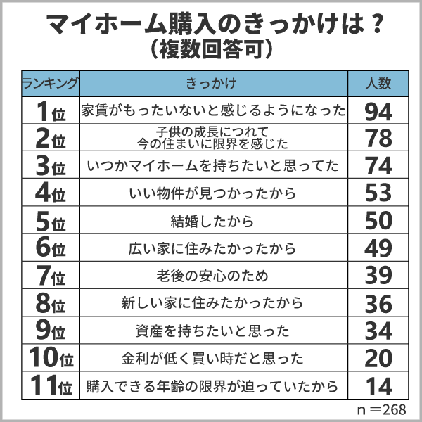 現在「持ち家」の方268人に「マイホームを購入したきっかけ」を聞いたところ、「家賃を払い続けるのがもったいないと感じるようになった」、「子供の成長につれて今の住まいに限界を感じた」、「いつかはマイホームを持ちたいと思っていた」という声が多く届きました。