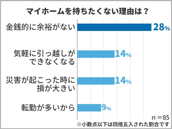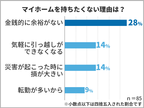 マイホームを持ちたくない理由には「金銭的な問題」や「気軽に引っ越しができなくなる」「天災が起こった時にリスクになる」の声が多く届きました。