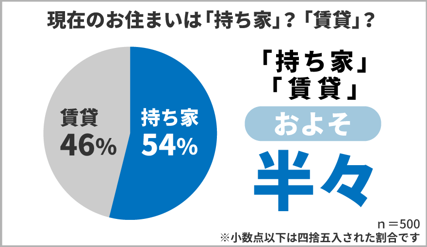 現在お住まいの住居形態を聞いたところ「持ち家」の方が54%、「賃貸」の方が46%でした。