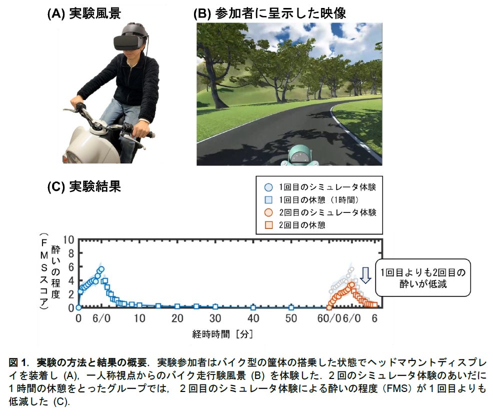 実験の参加者(60名)は、実験室内でバイク型筐体に乗った状態でヘッドマウントディスプレイを装着し [図1(A)]、バイクが左右に蛇行するシミュレータ映像 [図1(B)] を体験しました。各参加者、6分間のシミュレータを、休憩を挟んで2回体験しました。1回目と2回目のシミュレータを体験するあいだの休憩時間の長さが異なる次の3グループを設けました:①6分間(20名)、②酔いが回復するまで(20名)、③1時間(20名)。3グループともに、2回目のシミュレータ体験後に6分の休憩をとりました。参加者はシミュレータ映像を見ている最中と休憩中に、主観的な酔いの程度(FMS)を20段階で回答しました。