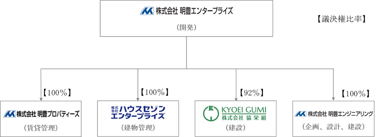創業56年、物造りにこだわった信頼と実績の東証上場デベロッパーとして、東京23区を中心に150棟を超える“新築1棟投資用賃貸住宅”を供給している株式会社明豊エンタープライズ(東京都目黒区:代表取締役 矢吹 満)を親会社とし、賃貸管理会社の株式会社明豊プロパティーズ(東京都目黒区:代表取締役 太田 孝)、株式会社ハウスセゾンエンタープライズ(京都府京都市:代表取締役 奥山 秀昭)、建設会社の株式会社明豊エンジニアリング(東京都目黒区:代表取締役 阪本 伸司)、株式会社協栄組(東京都世田谷区:代表取締役 五十嵐 一洋)で構成されております。