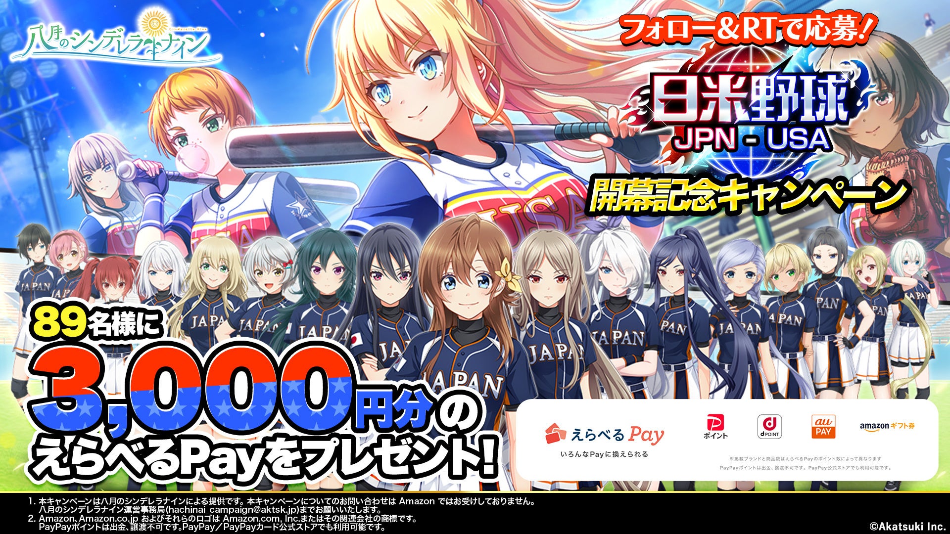 株式会社アカツキゲームス(本社:東京都品川区、代表取締役:戸塚佑貴、株式会社アカツキ100%子会社)は、当社より好評配信中のiOS/Android用アプリ『八月のシンデレラナイン(略称:ハチナイ)』において、2022年9月16日(金)より、アメリカでの日米親善試合を描く「日米野球編」が開始することをお知らせいたします。期間中、最大50連無料ガチャに加え、200連分相当のナインスター1000個が当たる5大キャンペーンも開始いたします。また、URに覚醒できるアメリア・サンダース(CV.東山奈央)が新登場いたします。
