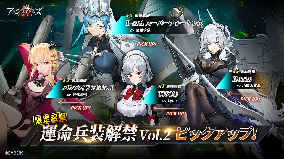 ※★3軽戦闘機「バンパイアF Mk.Ⅰ」、★3 重爆撃機「B-29A スーパーフォートレス」、★3 重戦闘機「TIS(A)」と★3 重戦闘機「Ho229」は限定DOLLSのため、「栄誉の輝きを永遠に Vol.2」召集が終了後、しばらく入手できなくなります。