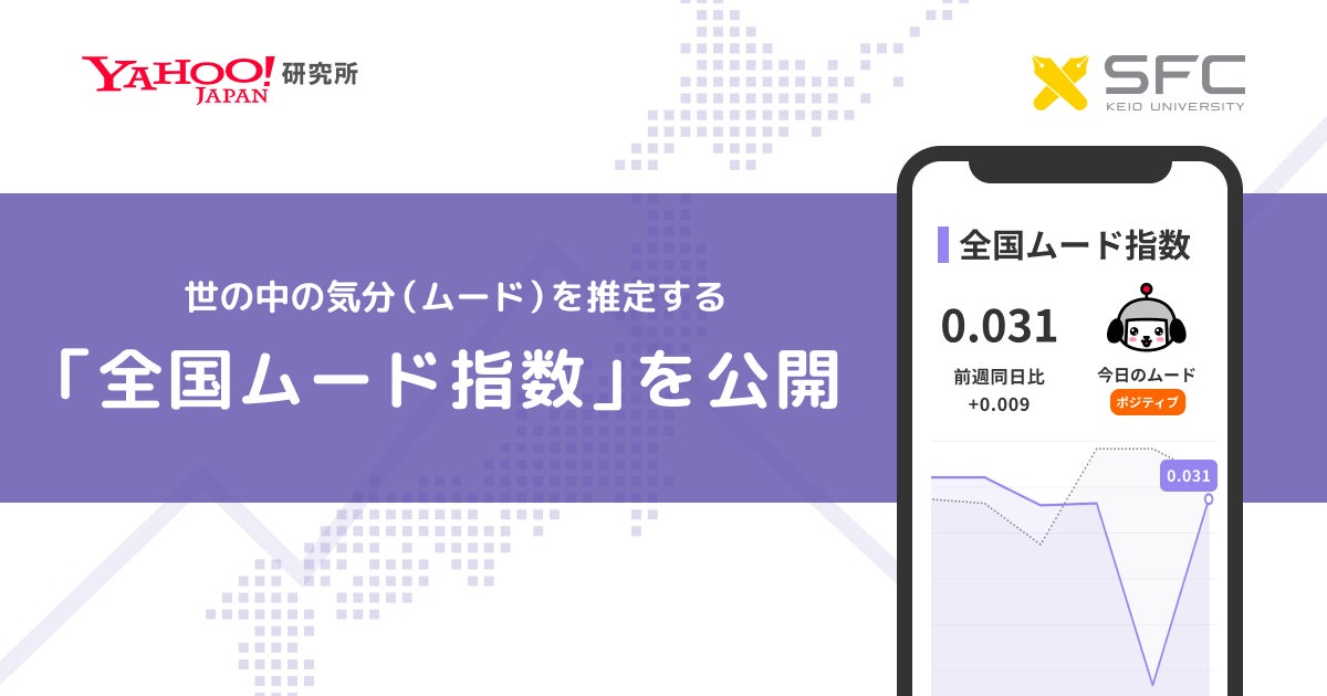 ヤフー株式会社(以下、Yahoo! JAPAN)で先進的なビッグデータ・AI技術の研究開発を担うYahoo! JAPAN研究所は、慶應義塾大学SFC研究所 上席所員(常勤) 大越 匡 准教授(環境情報学部)と連携し、ユーザーの検索キーワードなどの情報を基に「世の中の気分」(以下、ムード)の浮き沈みを推定する「全国ムード指数」(※1)を本日公開しました。