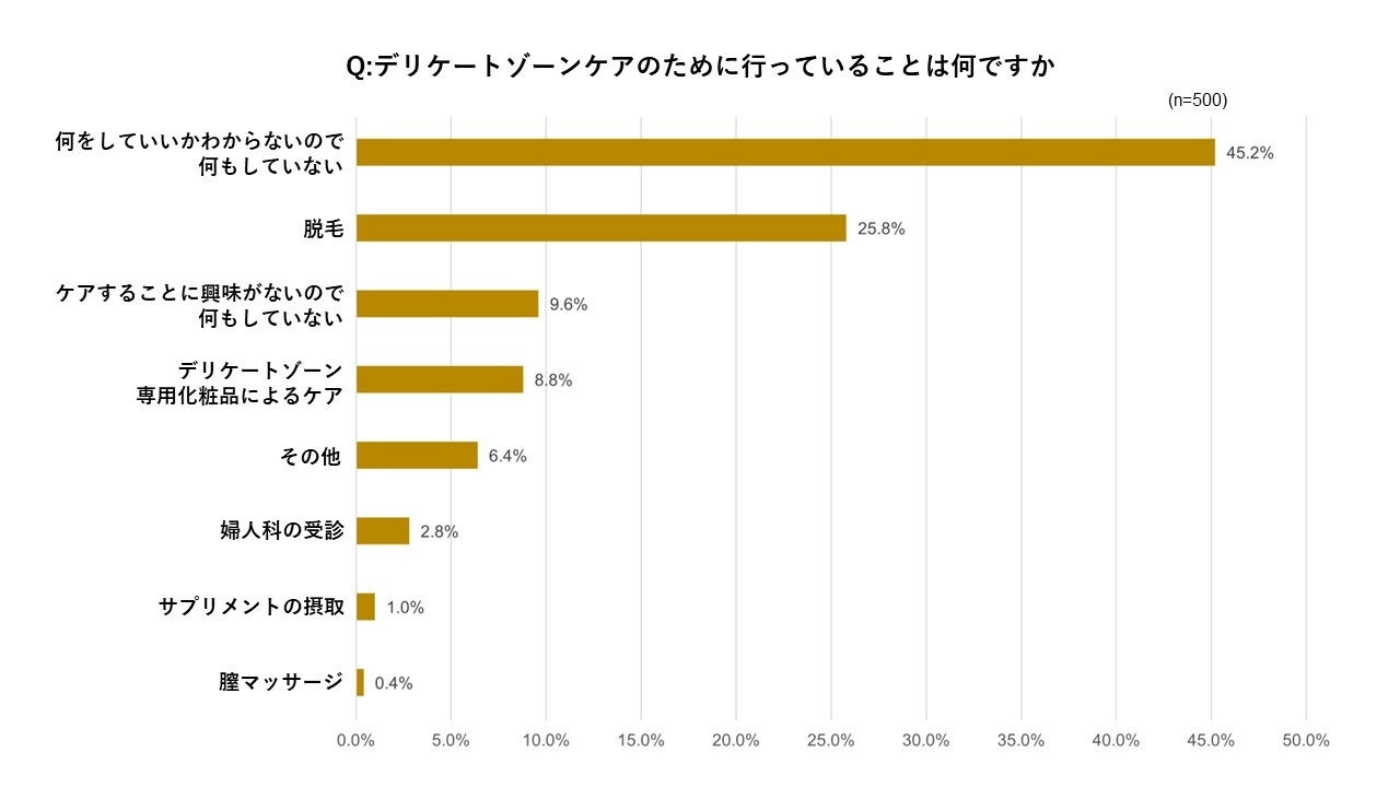 次に、デリケートゾーンケアの方法について回答してもらったところ、「何をしていいかわからないので、何もしていない」が最も多く45.2%でした。このことから、ケアに関する情報や知識がまだまだ浸透していない状況が分かりました。一方で、ケアを行っている人の内容は「脱毛」が25.8%、「デリケートゾーンケア専用化粧品によるケア」が8.8%と続いていました。
