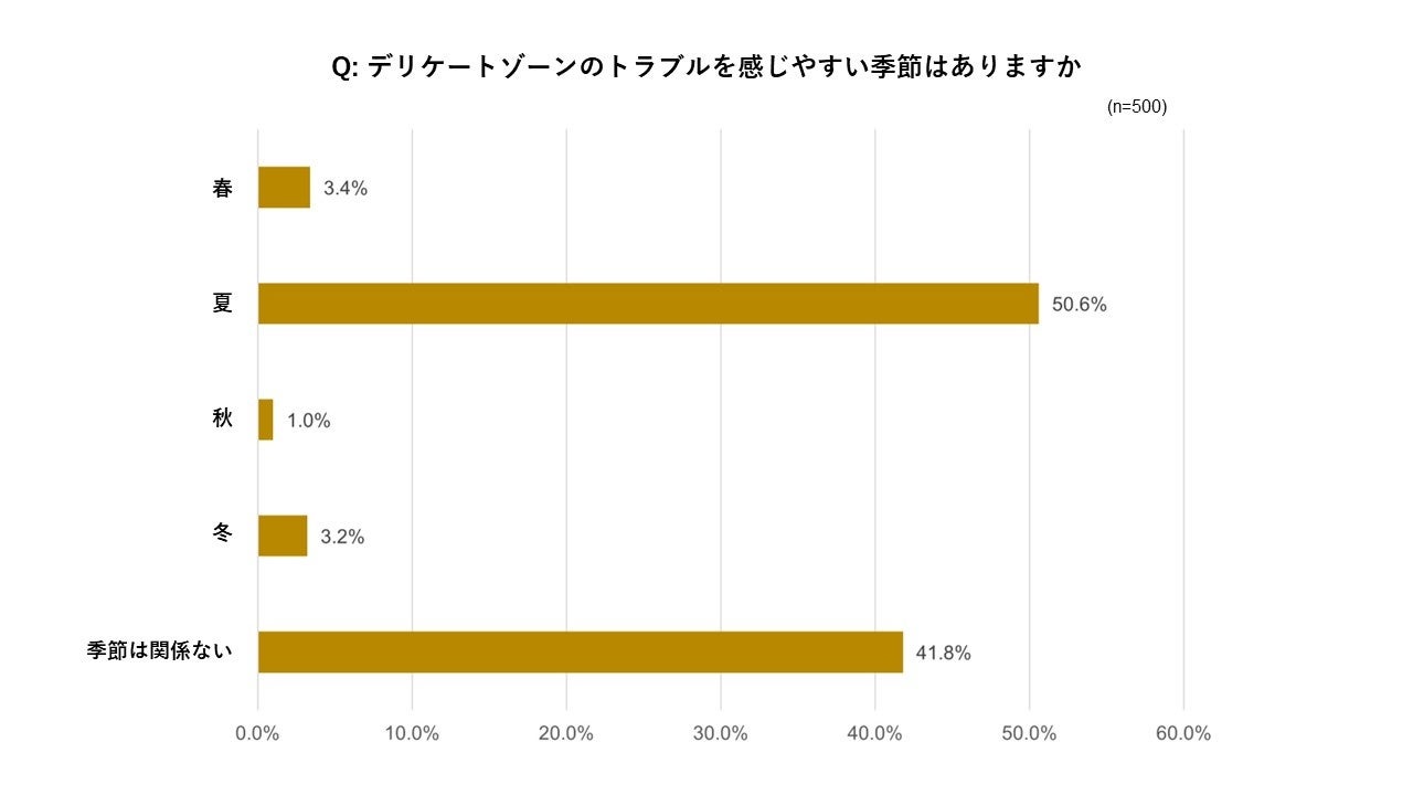 今回の調査で、トラブルを感じやすい季節として「夏」が最も多く50.6%でした。湿度75%を越えることが多くなる夏の湿気が、デリケートゾーンの蒸れを引き起こし、さらにはにおい、かぶれといったトラブルにつながっているようです。一方で、「季節は関係ない」と41.8%の方が回答していることから、夏だけではなく年間を通じてデリケートゾーンの悩みを抱えている人が多いことがわかりました。