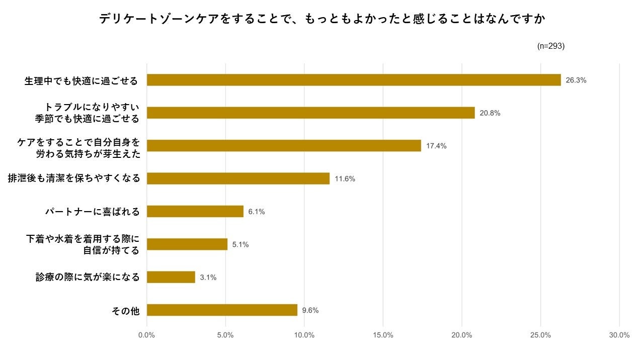 実際にデリケートゾーンのケアをしている人に最もよかったと感じていることについて回答してもらったところ、「生理中でも快適に過ごせる」が最も多く26.3%、次いで「トラブルになりやすい季節でも快適に過ごせる」が20.8%、「ケアをすることで自分自身に対していたわる気持ちが芽生えた」が17.4%でした。この結果からも、デリケートゾーンをきちんとケアすることで、トラブルを軽減でき、快適に過ごせることがわかりました。