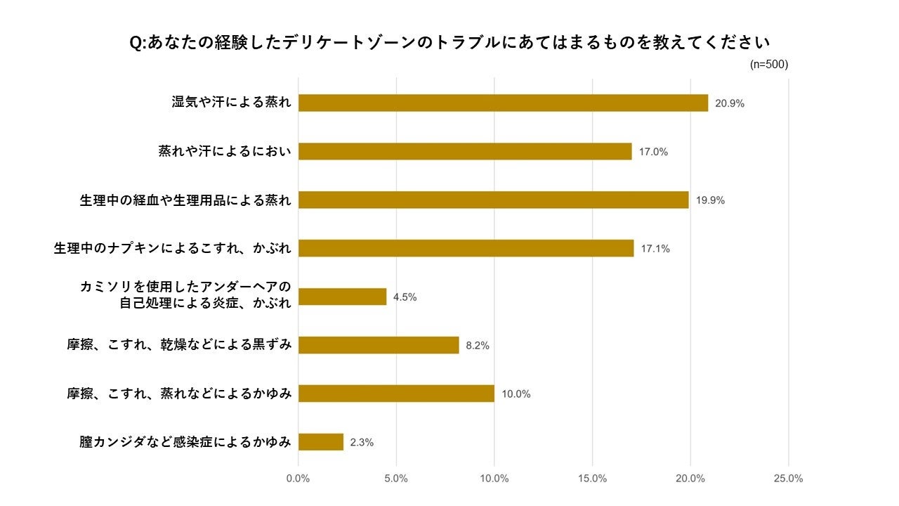これまでに経験したデリケートゾーンのトラブルを複数回答してもらったところ、「湿気や汗による蒸れ」が最も多く20.9%、次いで「生理中の経血や生理用品による蒸れ」が19.9%と、とにかく「蒸れ」に対する悩みが多い実態が明らかになりました。