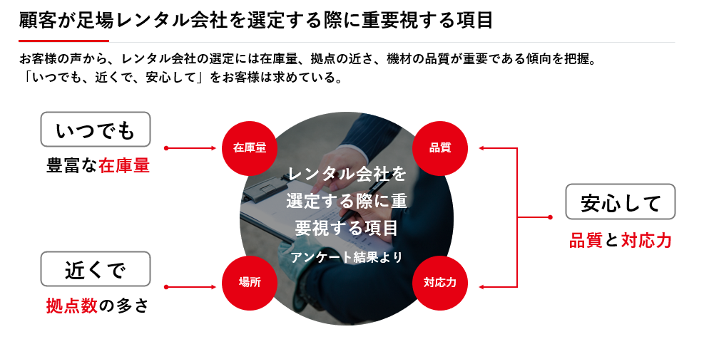 お客様が足場のレンタル会社を選定する際に、最も重要視する点が、「いつでも、近くで、安心して」借りることが出来るという3点であり、毎年お客様に実施するアンケートからは必ずこの3つが求められています。