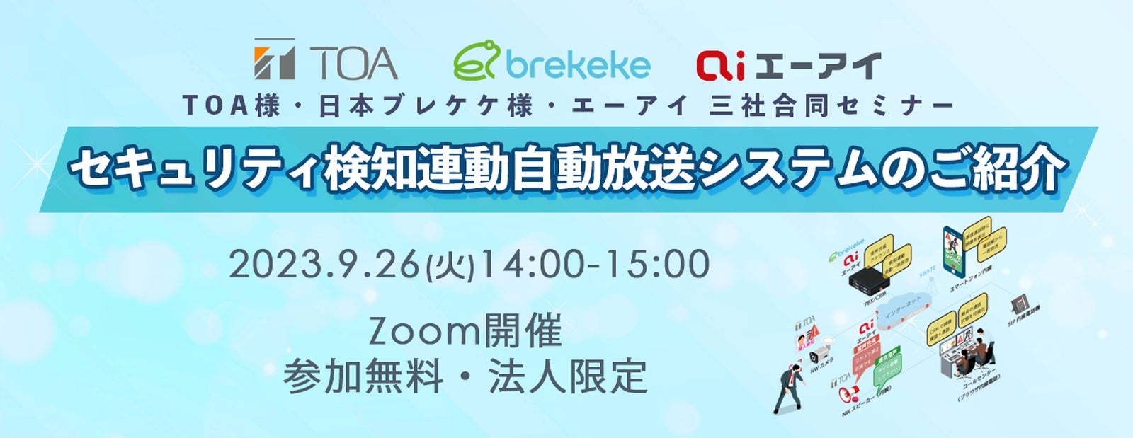【9月26日オンライン開催】「セキュリティ検知連動自動放送システムのご紹介」ウェビナーTOA様・日本ブレケケ様・エーアイ 三社合同開催のお知らせ