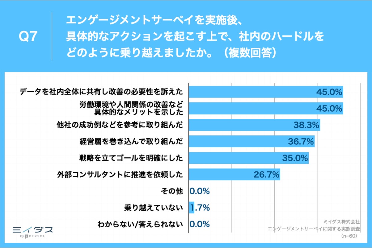 アクションを起こしている企業の経営者・役員のうち、Q6で「わからない/答えられない」以外を回答した方に「Q7.エンゲージメントサーベイを実施後、具体的なアクションを起こす上で、社内のハードルをどのように乗り越えましたか。(複数回答)」(n=60)と質問したところ、以下のような回答となりました。