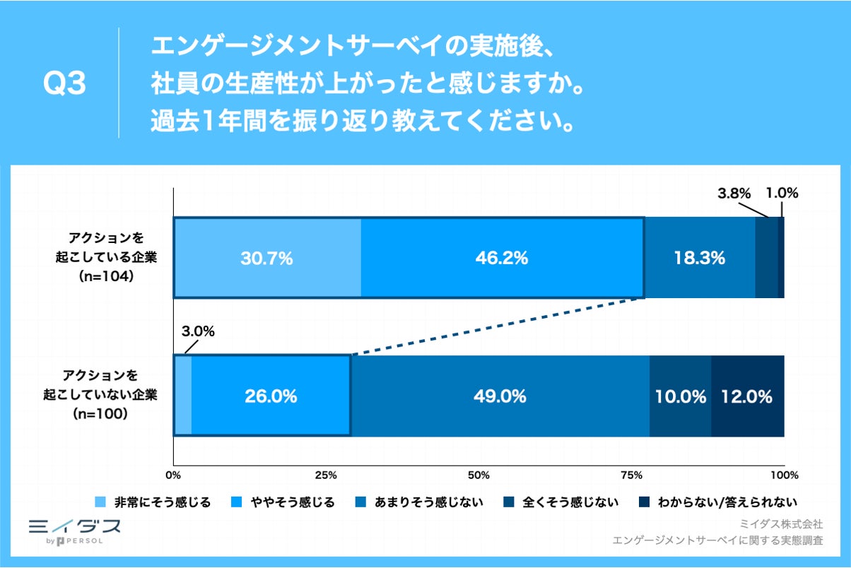エンゲージメントサーベイ実施後、アクションを起こしている企業の約8割が「社員の生産性向上」を実感、一方アクションを起こしていない企業では約3割に留まる