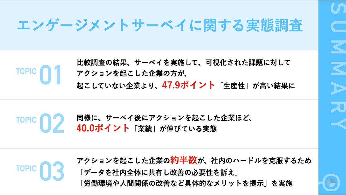 【エンゲージメントサーベイを使いきれてない?】比較調査の結果、サーベイ後にアクションを起こした企業の方が「生産性」が高く、「業績が向上」していることが明らかに!