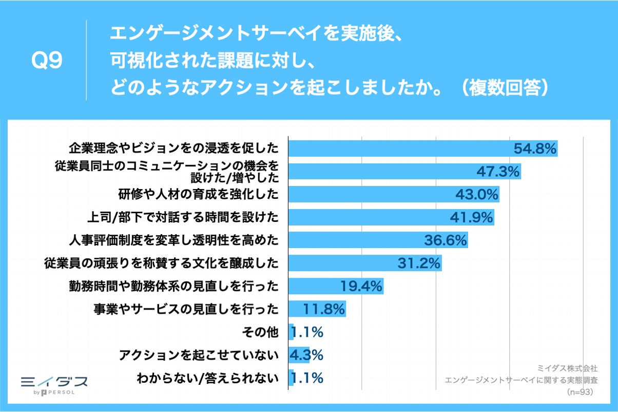 アクションを起こしており、Q2で「可視化された問題はない」「わからない/答えられない」以外を回答した経営者・役員に、「Q9.エンゲージメントサーベイを実施後、可視化された課題に対し、どのようなアクションを起こしましたか。(複数回答)」(n=93)と質問したところ、以下の回答になりました。