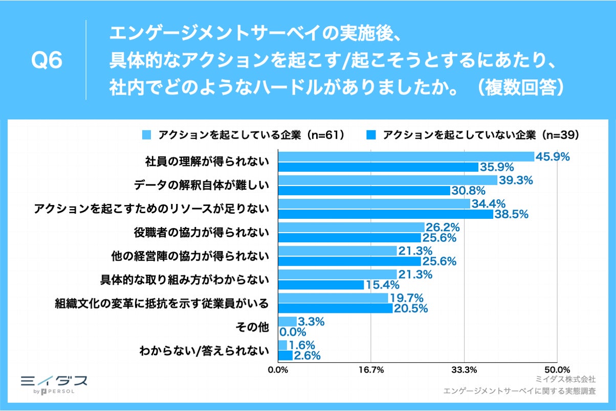 エンゲージメントサーベイ後にアクションを起こしている企業は、サーベイからわかる自社の課題について、より注意深く多くの気づきを得ていることがわかった