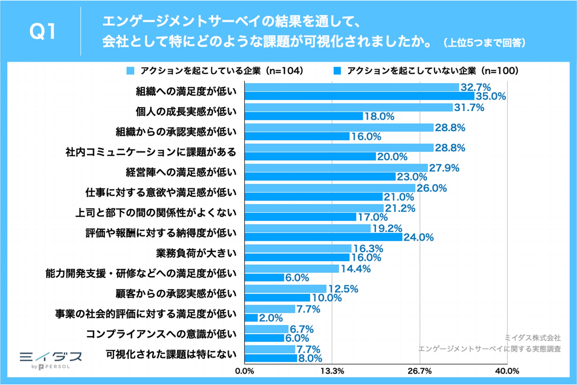 エンゲージメントサーベイで可視化された課題、アクションを起こしている企業は「個人の成長欲求」、起こしていない企業は「経営や制度」に関する項目が上位に