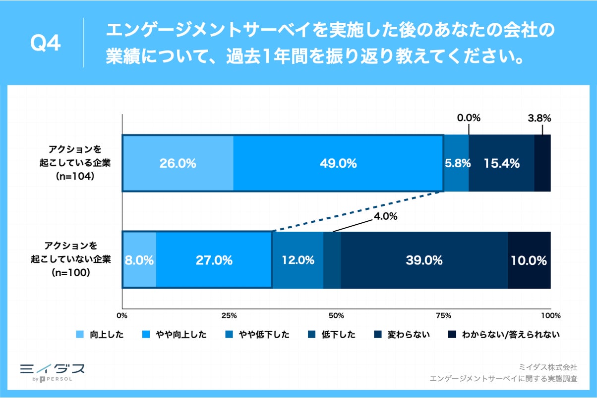 アクションを起こしている企業の75.0%が、エンゲージメントサーベイ実施後に「会社の業績が向上」と回答、アクションを起こしていない企業に比べて40.0ポイント高い結果に