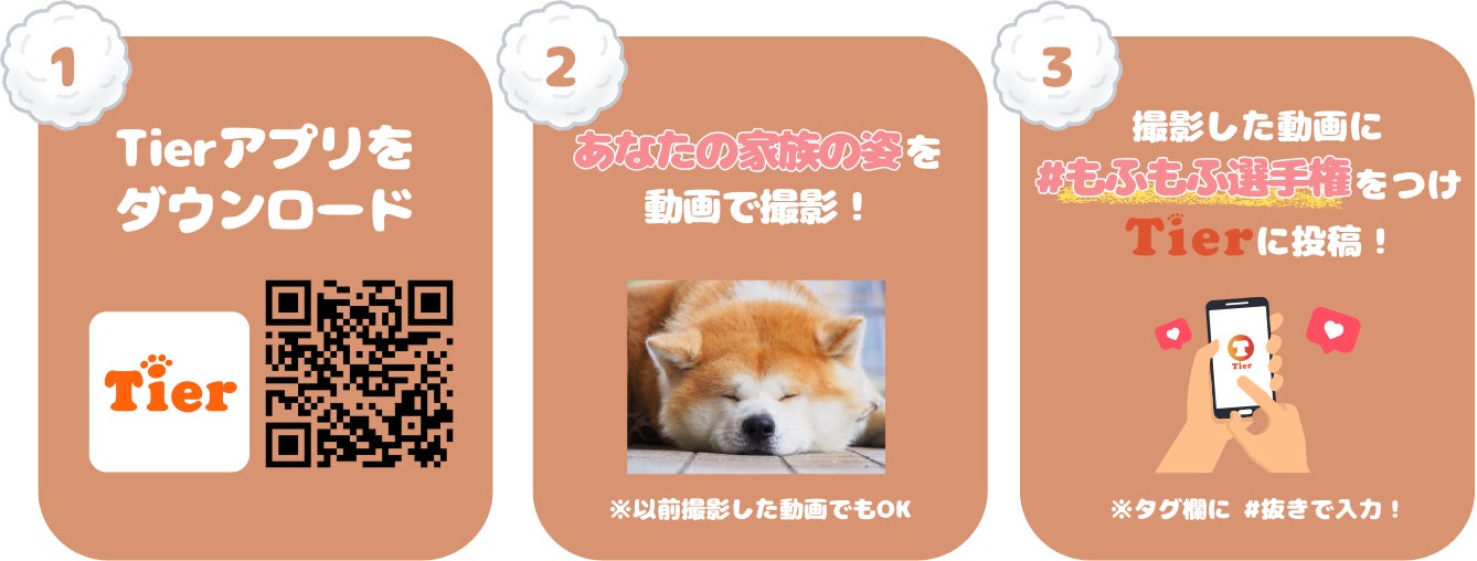 #もふもふ選手権のハッシュタグをつけた動画をTierアプリ内で投稿していただき、優秀賞に選ばれた動画は、3月1日(土)より1ヶ月間、渋谷愛ビジョンにて放映させていただきます。
