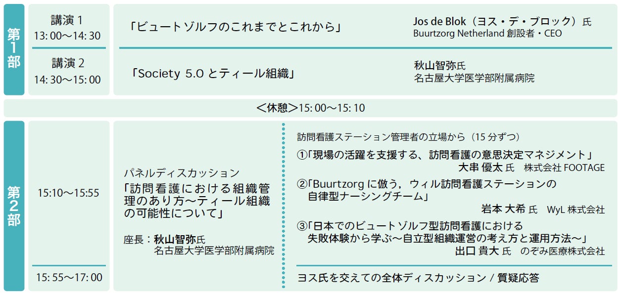 ビュートゾルフは、患者中心のケアとチームによる自律的な運営を特徴とし、世界中で注目を集めている看護管理モデルです。Jos 氏よりビュートゾルフが実践する看護管理のあり方や、ティール組織(自己管理型組織)としての特徴を詳しくご紹介いただき、後半では日本でビュートゾルフ型の訪問看護に取り組んでいるゲストのみなさまをお迎えし、ディスカッションを行います。ケアの質向上と効率化を目指す医療関係者のみなさまにとって、非常に有益な内容となっております。また、質疑応答で直接先生方にご質問することも可能です。