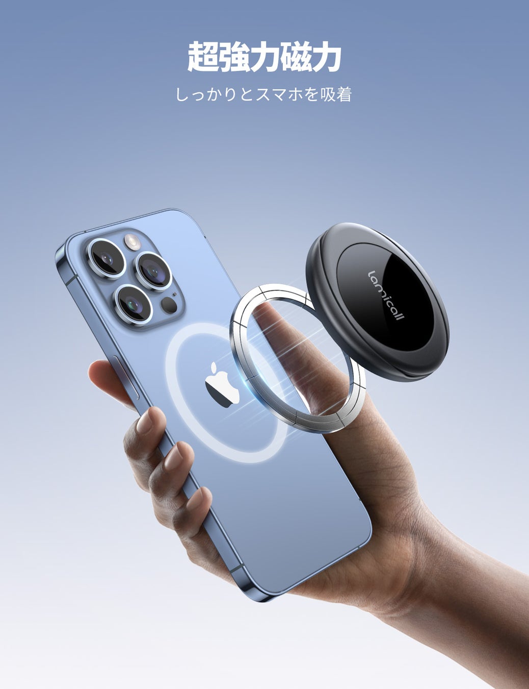 小さなボディで驚くべき安定感を発揮。本製品には、約1400gまでの荷重に耐える強力マグネットを使用しました。リングに指を入れるだけでスマートフォンを落とす恐怖から完全に逃れられます。また、iPhone14やiPhone13などのMagSafe シリーズをお使いの方やMagSafe搭載ケースをお使いの方は、そのままリングを装着していただけます。