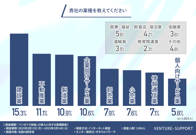 「建設業(15.3%)」「不動産業(11.1%)」「製造業(10.9%)」「企業向けサービス業(10.6%)」「卸売業(7.9%)」「小売業(7.6%)」「情報通信業(7.1%)」「個人向けサービス業(5.8%)」「医療・福祉(5.6%)」「飲食店・宿泊業(4.2%)」「金融業(3.6%)」「運輸業(3.5%)」「教育関連業(2.3%)」「その他(4.5%)」