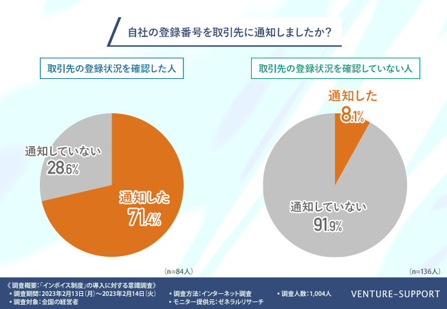 取引先の登録状況を確認した人については、「自社の登録番号を通知した(71.4%)」「自社の登録番号を通知していない(28.6%)」という回答結果となった。