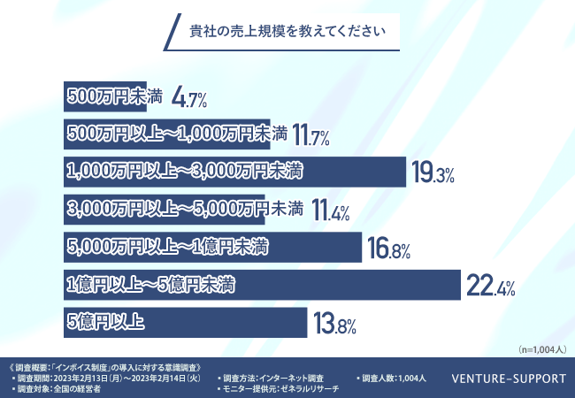 「500万円未満(4.7%)」「500万円以上~1,000万円未満(11.7%)」「1,000万円以上~3,000万円未満(19.3%)」「3,000万円以上~5,000万円未満(11.4%)」「5,000万円以上~1億円未満(16.8%)」「1億円以上~5億円未満(22.4%)」「5億円以上(13.7%)」