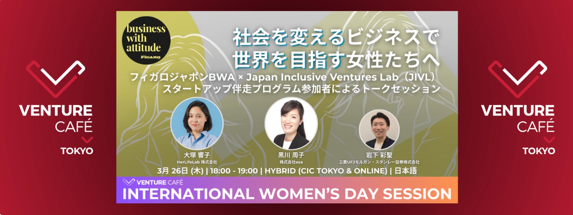 本イベントは、三菱UFJモルガン・スタンレー証券とフィガロジャポンBusiness with Attitude(BWA)が共催するもので、三菱UFJモルガン・スタンレー証券がモルガン・スタンレーのグローバルプログラムを活用して2024年に立ち上げたスタートアップ伴走プログラム JIVLの2025年度参加者によるトークイベントです。