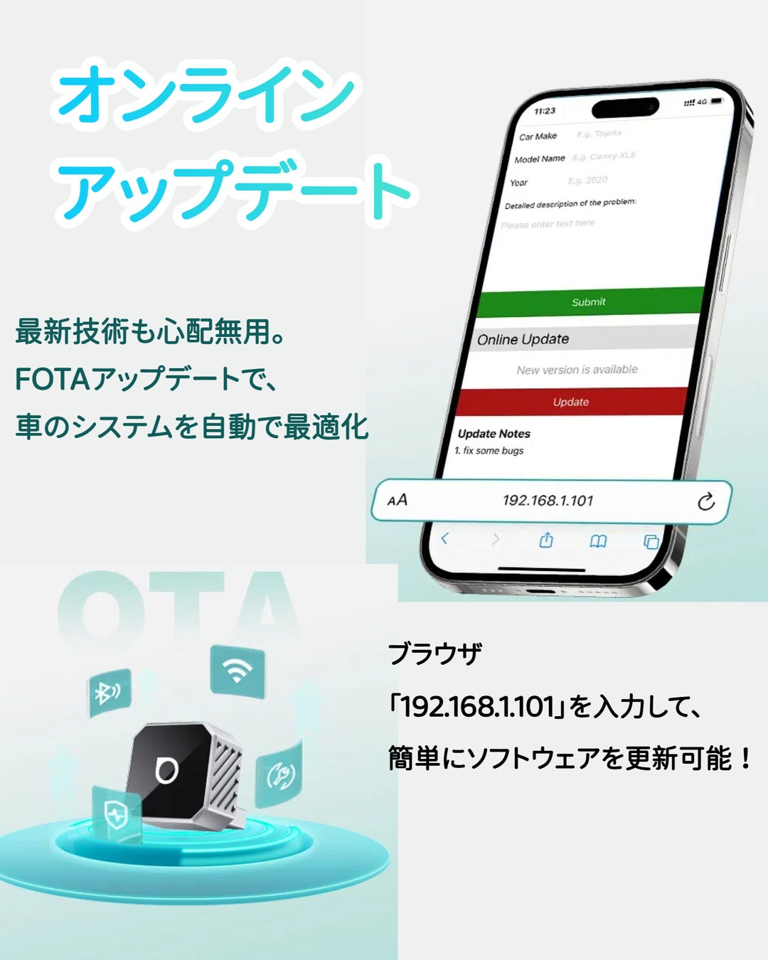 最新技術に常に対応できるFOTA(Firmware Over The Air)アップデート機能を搭載。面倒な操作は不要で、スマートフォンのブラウザから簡単にソフトウェア更新が可能です。