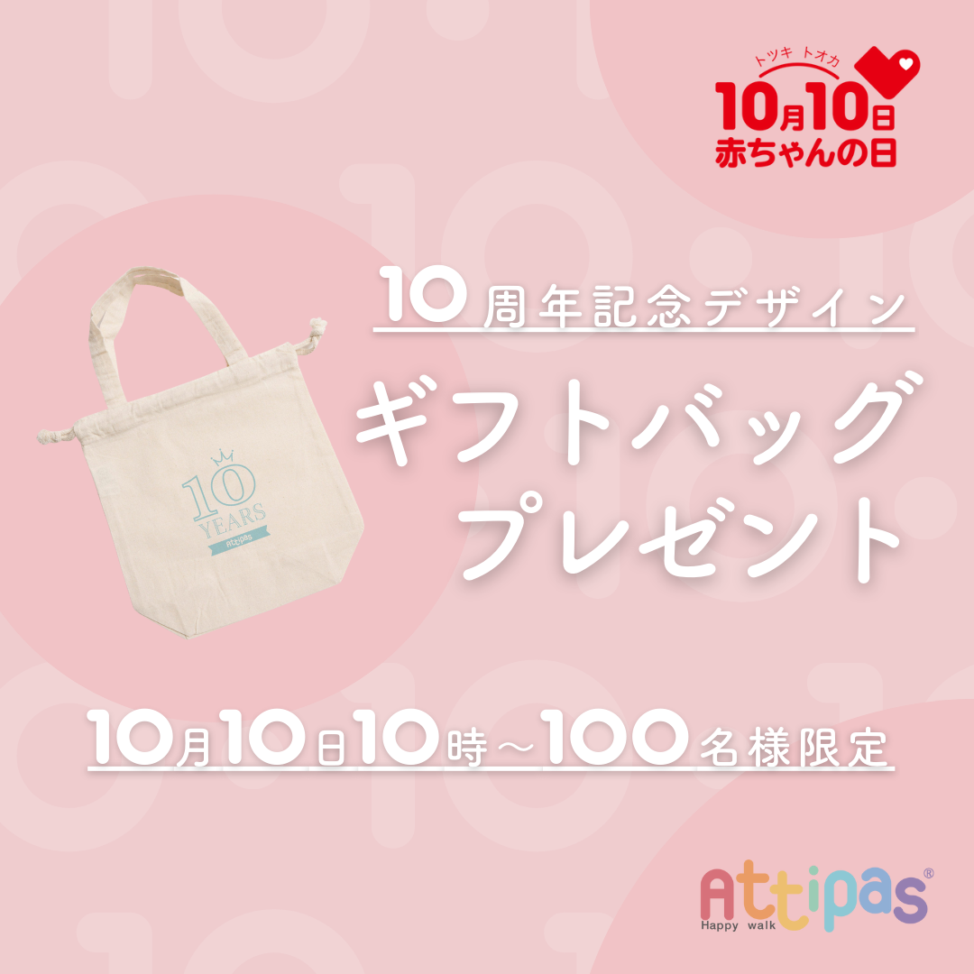 10月10日(火)の赤ちゃんの日から、アティパス公式オンラインサイト(https://attipas.jp/)にてお買上の先着100名様に、「アティパス10周年ロゴ入りギフトバッグ」をプレゼントいたします。