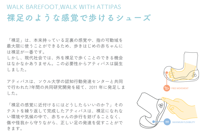 Attipas(アティパス)は、成長によって変化する赤ちゃんの足に着目し、産学共同で7年にも及ぶ研究の結果に基づいて作られた歩育シューズです。2009年にスタートし、今ではオーストラリア、スペイン、アメリカなど世界30ヵ国以上のママやパパに愛される安心、安全のブランドです。
