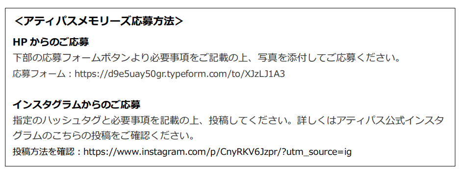 指定のハッシュタグと必要事項を記載の上、投稿してください。詳しくはアティパス公式インスタ グラムのこちらの投稿をご確認ください。