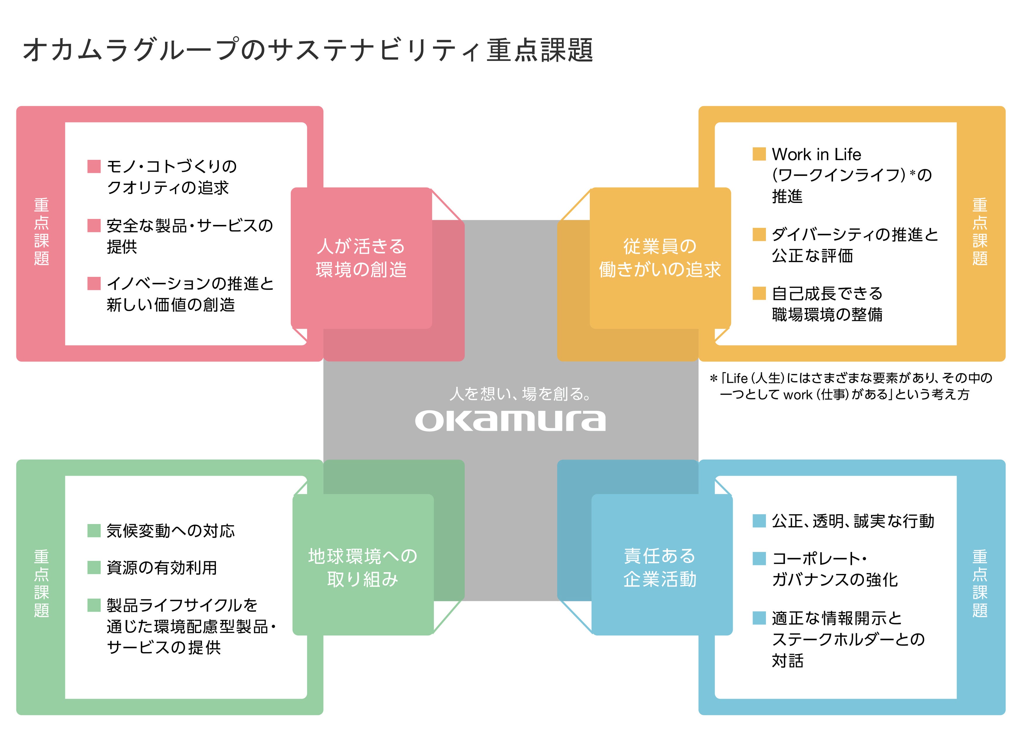 オカムラグループでは、持続可能な社会の実現が求められる新たな価値観の社会の中で、企業が持続的に成長するためには、ESGを中心に捉えた事業活動が重要であると捉えています。「豊かな発想と確かな品質で、人が活きる環境づくりを通して、社会に貢献する。」をミッションとし、企業価値のさらなる向上と社会課題の解決を目指します。ステークホルダーの皆さまからの期待や社会の要請に対し、グループ一体となって応えていくために、「人が活きる環境の創造」「従業員の働きがいの追求」「地球環境への取り組み」「責任ある企業活動」の4つの観点から重点課題を特定し、取り組みを推進しています。