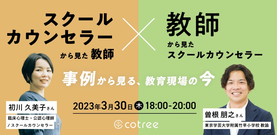 オンラインカウンセリング・コーチングの「cotree」を展開する株式会社cotree(本社:東京都港区、代表取締役:西岡 恵子、以下cotree)は、2023年3月30日(木)に「スクールカウンセラーから見た教師×教師からスクールカウンセラー セミナー」を開催することをお知らせいたします。今回は、臨床心理士・公認心理師/スクールカウンセラーの初川 久美子さんと東京学芸大学附属竹早小学校 教諭の曽根 朋之さんをお迎えして、スクールカウンセラーと教師の双方の立場から学校教育現場のお話を伺うセミナーです。皆さまのエントリーを心よりお待ちしています。