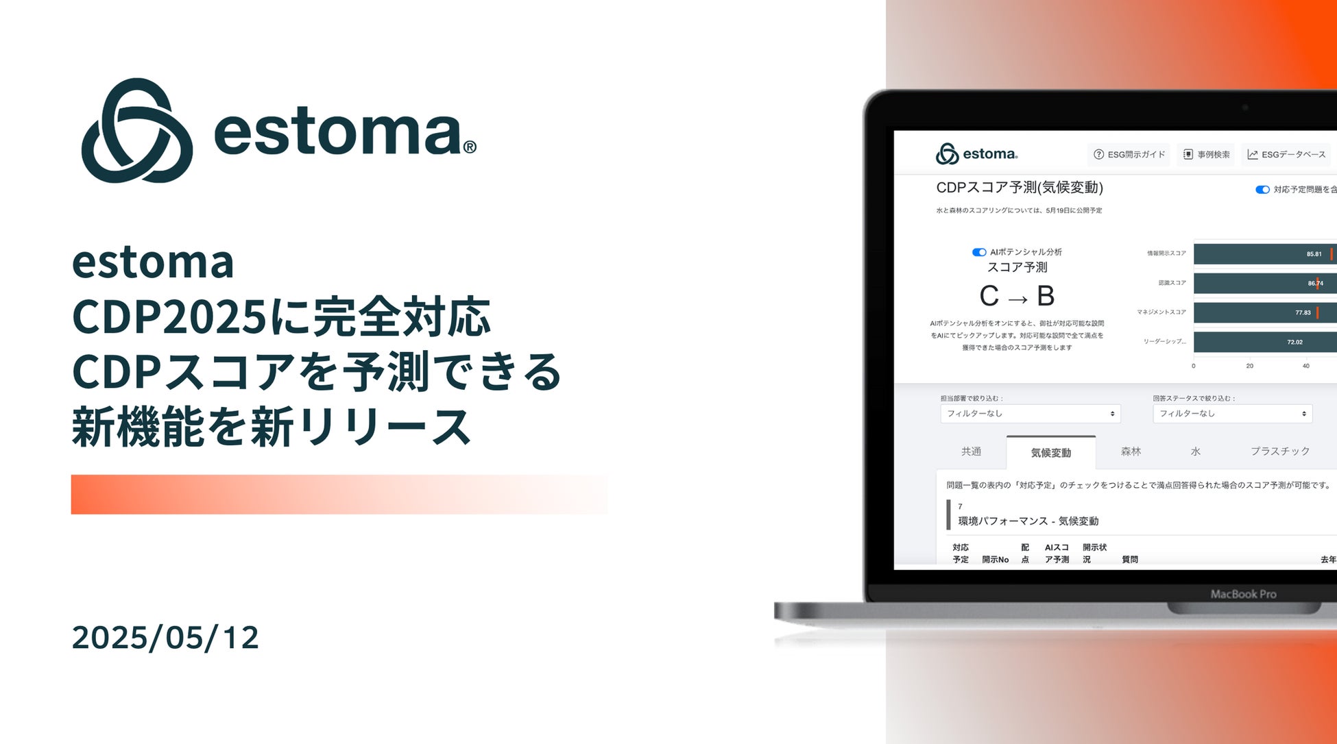 ESG情報開示を効率化するESG統合情報開示クラウド「estoma」、CDP2025に対応し、スコアリングを予測できる新機能を新リリース