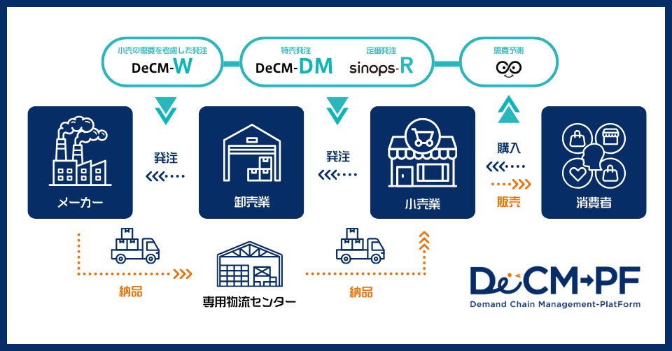 DeCM-PFは、小売業・卸売業・製造業をつなぐことで、食品バリューチェーン全体を最適化するプラットフォームです。現在、製造業や卸売業では、小売業や消費者が欲しい商品数を正確に把握することがむずかしく、見込みで生産・在庫計画をたてた結果、余分な在庫が発生したり、効率の悪い物流が生じています。DeCM-PFは、小売業の実績や計画に基づいてAIが算出した高精度な需要予測データを、卸売業や製造業に連携することで食品流通の課題を解決し、バリューチェーンの最適化を推進します。