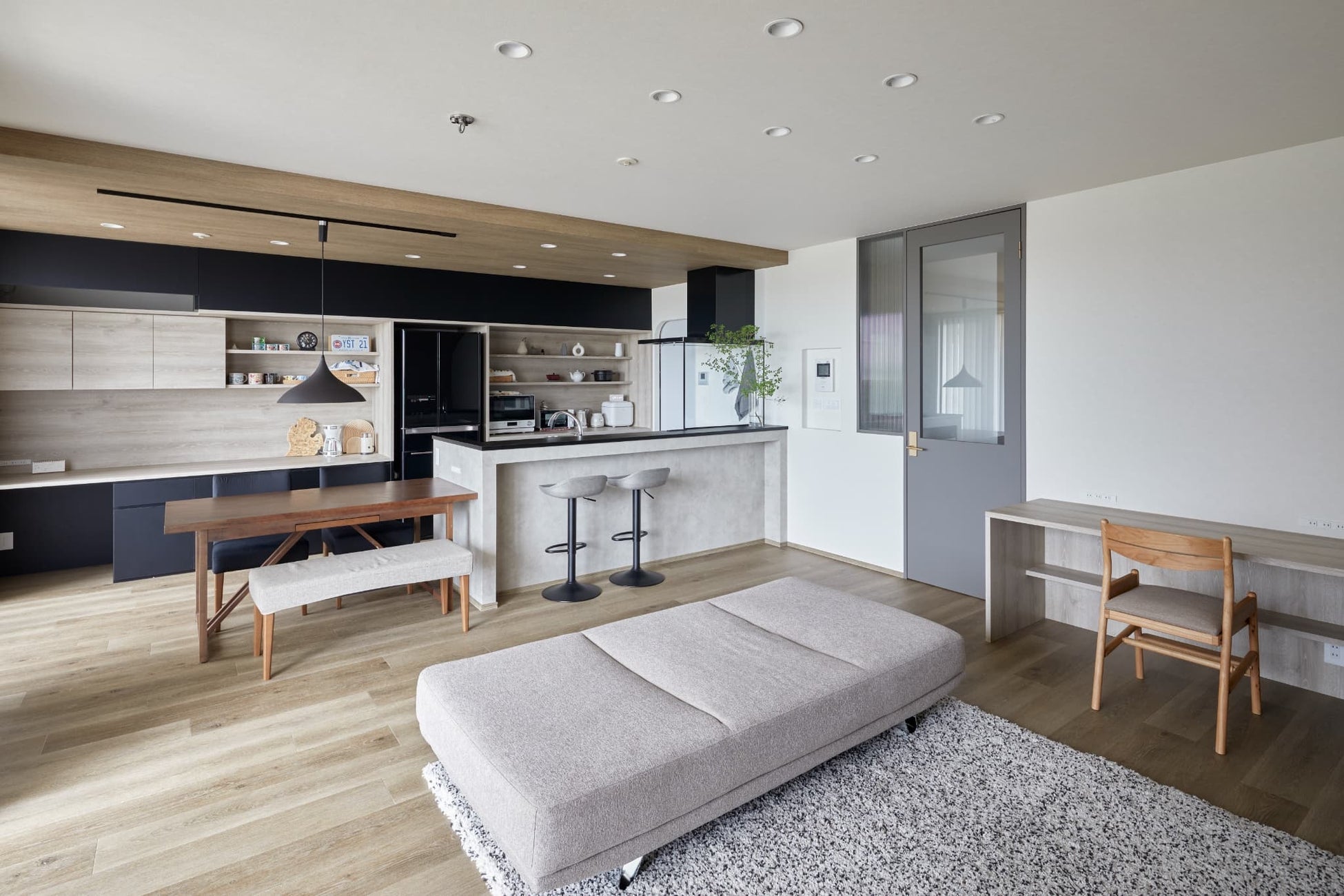 造作カップボードの面材はブラック、キッチン腰壁はモルタル調の壁紙を取り入れてカッコいい空間としつつも、木目のカウンターや天井で柔らかさを表現しています。
